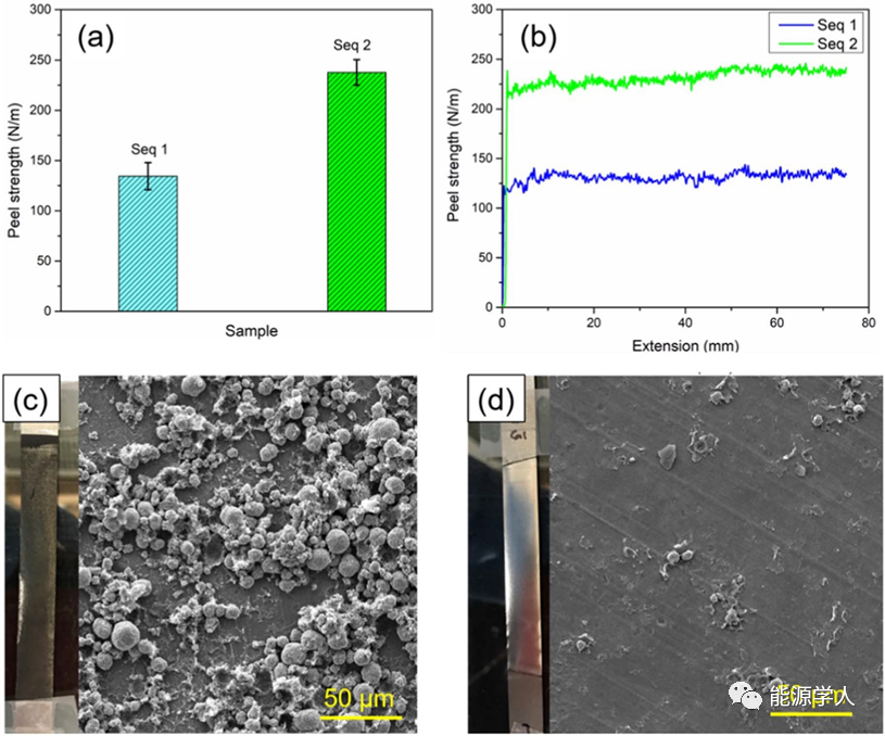圖5.兩種順序制備電極的粘結(jié)強度測量(a)剝離強度圖(b)剝離強度-延伸率曲線(c)和(d)分別是剝離測試后對應(yīng)于的電極表面
