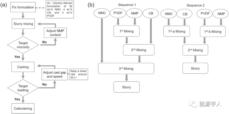 圖1.(a)電極制造過程的優(yōu)化策略。(b)制備電極漿料的混合順序1和順序2的示意圖
