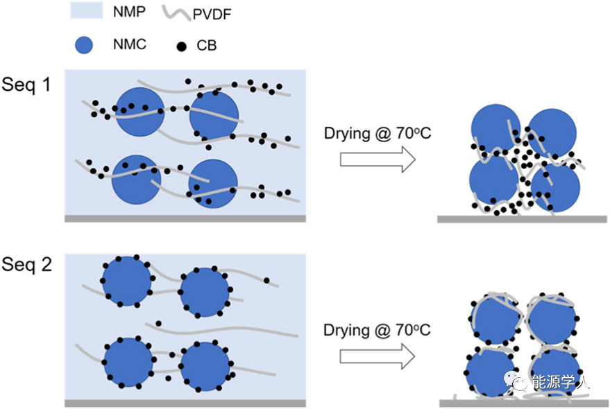 因此,順序1制成的漿料的“強度”由PVDF鏈的纏結(jié)和CB的填充效應(yīng)共同提供。順序2制成的漿料的“強度”主要由PVDF鏈的纏結(jié)提供。導(dǎo)致順序2制成的漿料流動性較好。在干燥過程中,使用順序1制得的漿料隨著NMP的蒸發(fā),CB納米顆粒被捕集在PVDF聚合物基質(zhì)中,形成了填充NMC顆粒之間空間的多孔CB/PVDF簇。在干燥使用順序2制得的漿料時,附著在NMC顆粒上的CB納米顆粒會吸收PVDF,從而在NMC顆粒上形成致密的CB/PVDF層。