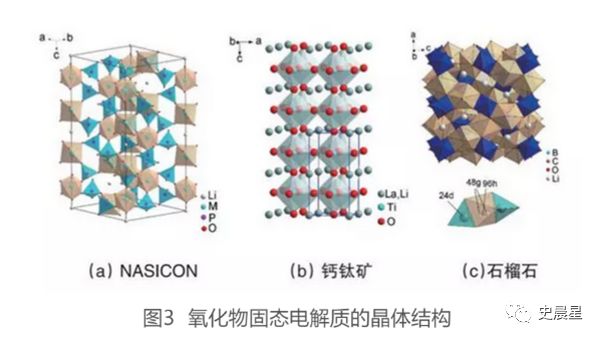 氧化物固體電解質按照物質結構可以分為晶態和非晶態兩類,晶態電解質包括鈣鈦礦型、NASICON型(Na快離子導體)、石榴石型、LISICON型等,玻璃態(非晶態)氧化物的研究熱點是用在薄膜電池中的 LiPON 型電解質和部分晶化的非晶態材料。