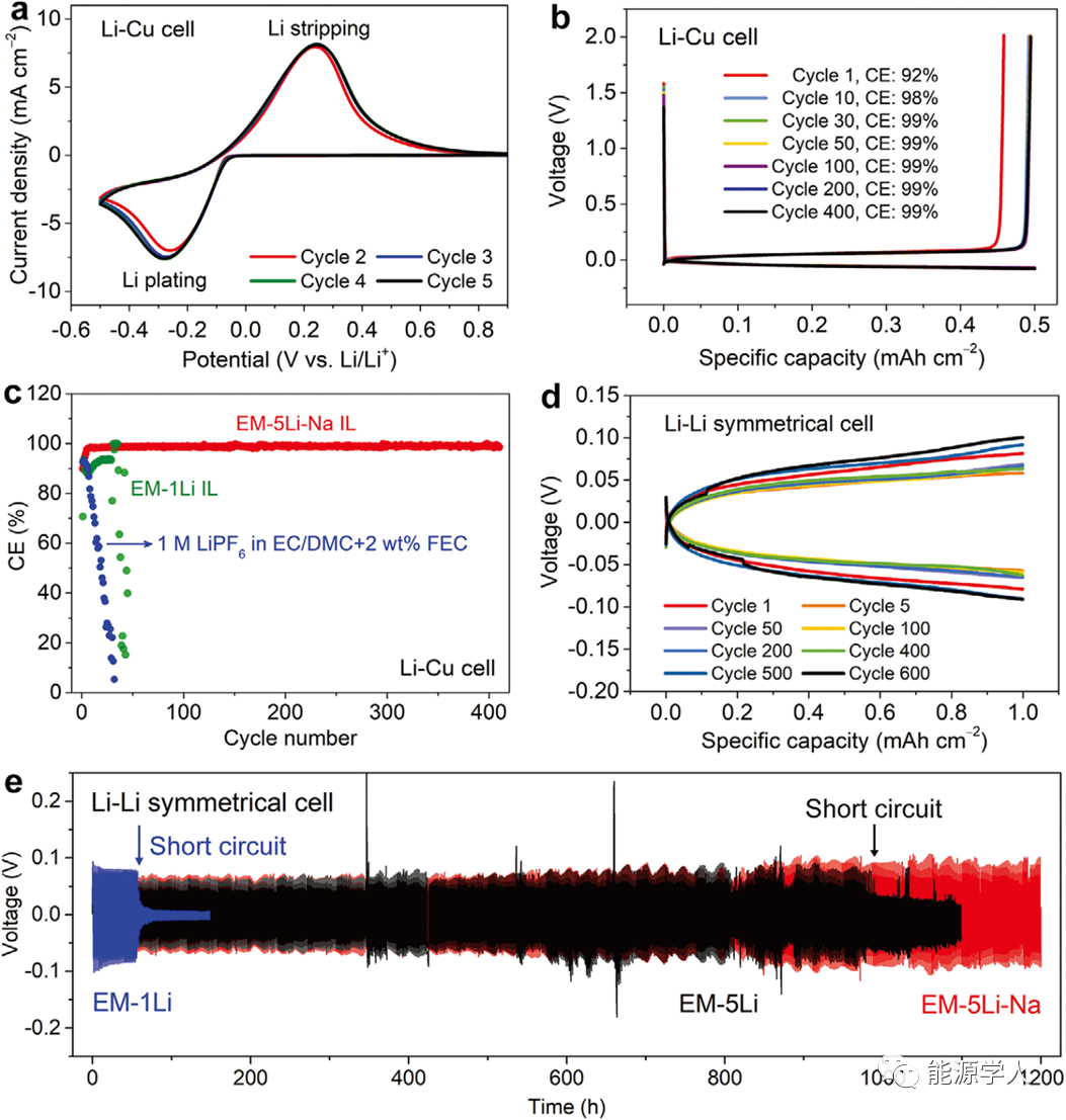圖2 不同離子液體電解液的電化學性能。a)采用 EM-5Li-Na IL電解液的Li-Cu電池的CV曲線,掃描速率為2mvs?1。b) 使用EM-5Li-NaIL電解液的Li-Cu電池進行Li沉積/溶解時的充放電曲線。c)分別采用傳統有機電解液、EM-1Li和EM-5Li-Na IL電解液時Li-Cu電池中Li沉積/溶解的庫侖效率。(b,c)中電流密度和面積比容量分別為0.5 mA cm?2和0.5 mAh cm?2。d)使用EM-5Li-Na IL電解液的Li/Li對稱電池在不同循環次數下的Li沉積/溶解曲線。e)分別采用EM-1Li、EM-5Li和EM-5Li-Na IL電解液時Li /Li對稱電池的Li沉積/溶解曲線。(e,f)中電流密度和面積比容量分別為1 mA cm?2和1 mAh cm?2。