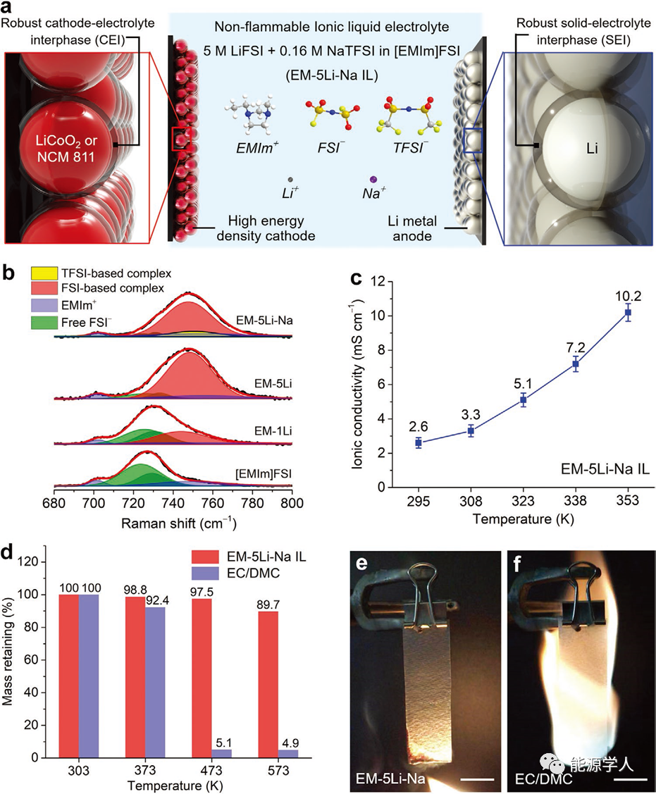 圖1 不易燃離子液體電解液的特性。a) EM-5Li-Na IL電解液的組成與電池結構示意圖。b)純[EMIm]FSI、EM-1Li、EM-5Li和EM-5Li-Na ILs的拉曼光譜。c) EM-5Li-Na IL在不同溫度下的離子電導率。d) EM-5Li-Na IL電解液與常規有機電解液(1 M LiPF6-EC/DMC, 1:1 vol)的熱穩定性分析。e,f) EM-5Li-Na IL電解液(e)傳統1 M LiPF6-EC/DMC有機電解液(f)的易燃性測試