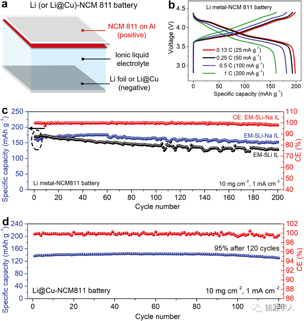 圖5 采用EM-5Li-Na-IL電解液的NCM811基鋰金屬電池。a) NCM811基鋰金屬電池結構示意圖,負極為Li金屬或Li@Cu。b) NCM811基鋰金屬電池不同倍率下(0.25-1 C,25-200 mA g-1)的恒流充放電曲線。c) 分別使用EM-5Li和EM-5Li-NaIL電解液的Li-NCM811電池在0.5 C下的循環穩定性。(b-c)中的比容量均基于NCM811的質量。d) 使用EM-5Li-Na IL電解液的Li@Cu-NCM811電池在0.5 C下的的循環穩定性。所沉積Li金屬的容量約1.8倍過量。(d)中比容量基于正、負極總質量。(a-d)中NCM811的載量為≈10 mgcm?2。