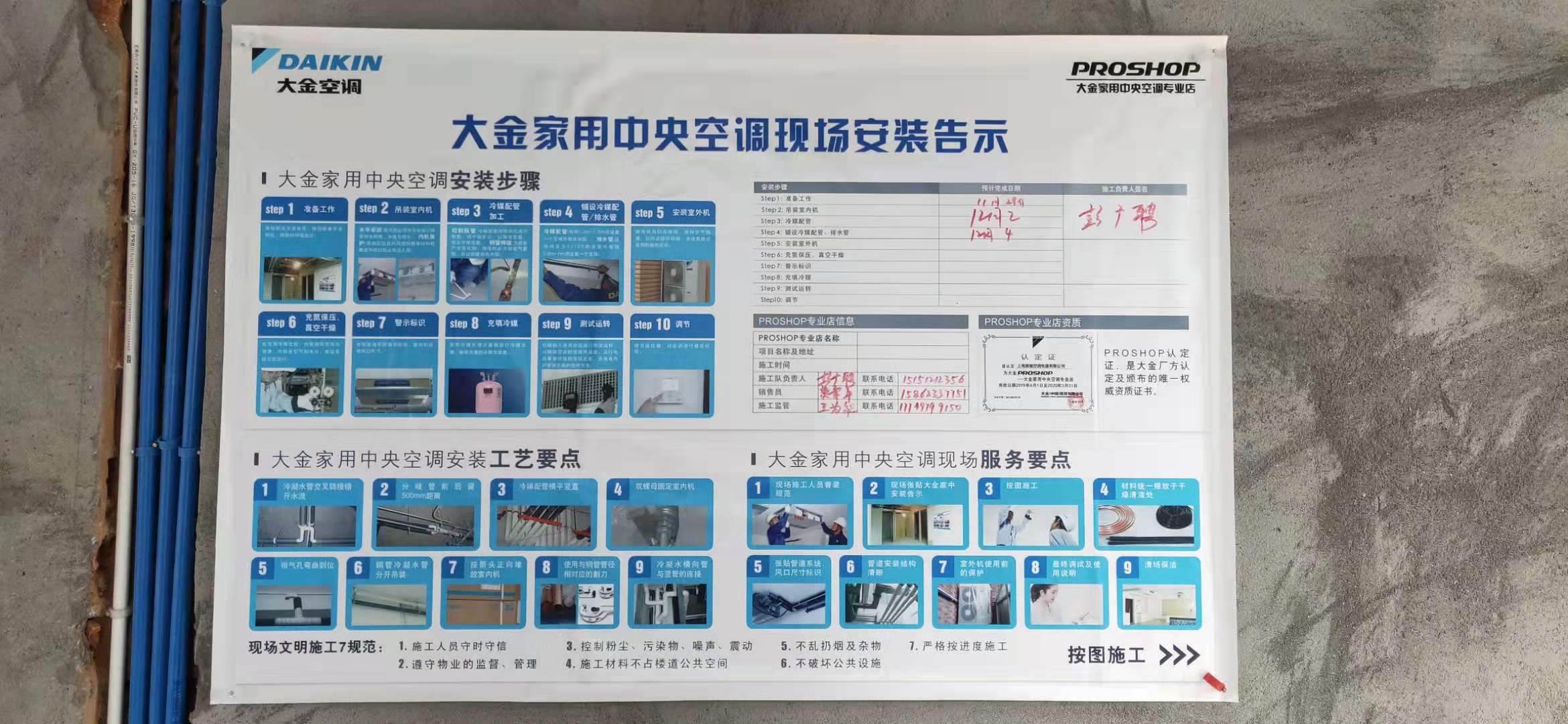 送貨進場,中央空調機器要靠邊擺放整齊,正規施工人員都需要穿統一的工作服進場施工,并在屋內懸掛“公示牌”:能清楚的知道業主家負責安裝人員,責任到人;正規的施工會給業主一個保障,由一個團隊負責一家施工,全部完工后再做另外一家的活動,不會為了多做活而趕工期。